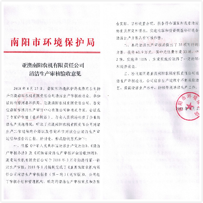 8月23日南陽市清潔生產(chǎn)審計(jì)中心攜權(quán)威認(rèn)證專家對我公司清潔生產(chǎn)情況進(jìn)行審核,會(huì)議上,專家對我公司清潔生產(chǎn)情況給予高度評價(jià),一致認(rèn)定亞澳農(nóng)機(jī)通過清潔生產(chǎn)審核,同時(shí)也為公司后續(xù)清潔生產(chǎn)提出一定要求及需改進(jìn)的地方。我公司副總表示,接受專家們的建議,后續(xù)公司在清潔生產(chǎn)方面也將不斷改進(jìn)。