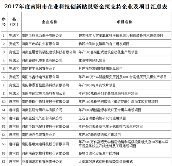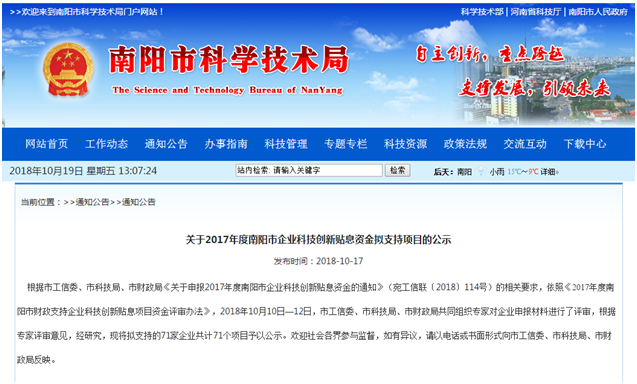 根據市工信委、市科技局、市財政局《關于申報2017年度南陽市企業(yè)科技創(chuàng)新貼息資金的通知》(宛工信聯(lián)〔2018〕114號)的相關要求,依照《2017年度南陽市財政支持企業(yè)科技創(chuàng)新貼息項目資金評審辦法》,2018年10月10日—12日,市工信委、市科技局、市財政局共同組織專家對企業(yè)申報材料進行了評審,根據專家評審意見,經研究,現(xiàn)將擬支持的71家企業(yè)共計71個項目予以公示。歡迎社會各界參與監(jiān)督,如有異議,請以電話或書面形式向市工信委、市科技局、市財政局反映。