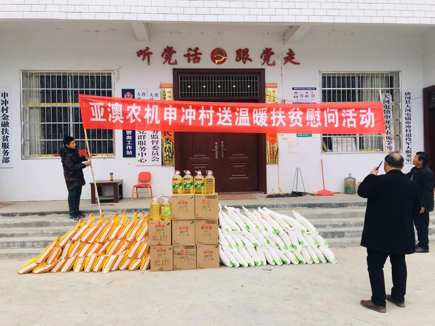 為積極貫徹落實(shí)唐河縣委縣政府”百企幫百村”的扶貧工作精神,履行企業(yè)社會(huì)責(zé)任,按照縣扶貧辦工作統(tǒng)一部署,亞澳農(nóng)機(jī)結(jié)合對口幫扶的申沖村實(shí)際情況,因地制宜,統(tǒng)籌規(guī)劃,務(wù)求實(shí)效,在2018-2019年開展了一系列的扶貧幫困工作。