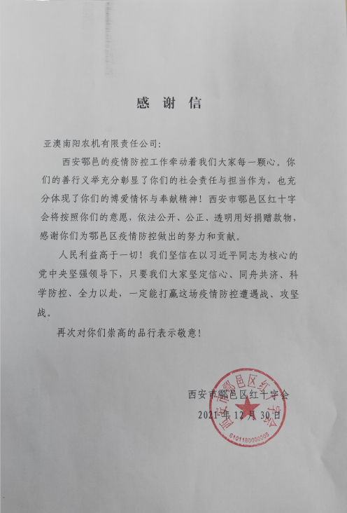 十二月份,一場突如其來的疫情打亂了西安人平靜的生活,面對日趨嚴(yán)峻的疫情態(tài)勢,亞澳農(nóng)機(jī)作為一家有社會(huì)責(zé)任感的企業(yè)積極奉獻(xiàn)自己力量,亞澳農(nóng)機(jī)南陽公司為鄠邑區(qū)紅十字會(huì)捐款100000元,亞澳農(nóng)機(jī)總公司為鄠邑區(qū)甘亭街道東韓村捐款40000元,亞澳農(nóng)機(jī)與社會(huì)各界人士并肩作戰(zhàn),為疫情防控工作貢獻(xiàn)自己的一份薄力。