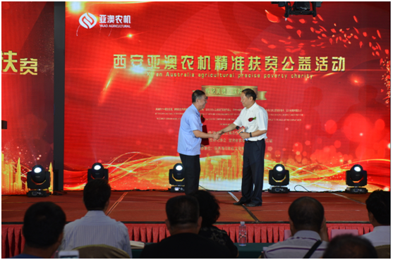 開(kāi)機(jī)儀式上,中國(guó)農(nóng)機(jī)化協(xié)會(huì)還就“甘肅省蘭州市永登縣”精準(zhǔn)扶貧工作給予亞澳高度的認(rèn)可。永登縣團(tuán)莊村屬干旱貧困山區(qū),全村現(xiàn)有7個(gè)村民小組,421戶(hù)、1696人。近年來(lái),幫扶單位先后捐贈(zèng)了30多臺(tái)(套)特色農(nóng)機(jī)具,但仍缺少大中型農(nóng)機(jī)具,農(nóng)機(jī)化服務(wù)能力不足,不能滿(mǎn)足農(nóng)業(yè)生產(chǎn)需求。此次中國(guó)農(nóng)業(yè)機(jī)械化協(xié)會(huì)聯(lián)合亞澳公司等有關(guān)單位向團(tuán)莊村捐贈(zèng)價(jià)值40多萬(wàn)元農(nóng)業(yè)機(jī)械,必將對(duì)團(tuán)莊和周邊鄉(xiāng)村農(nóng)業(yè)和農(nóng)村經(jīng)濟(jì)發(fā)展、全面建設(shè)小康社會(huì)起到很大地推進(jìn)作用。